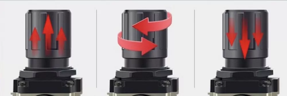 समायोजन टोपी पर एक दबाव पैमाना है। जब हवा की आपूर्ति की जाती है, तो दबाव बढ़ाने के लिए घुंडी को ऊपर खींचें और इसे "+" चिह्न की ओर दक्षिणावर्त घुमाएँ। समायोजन के बाद, इसे लॉक करने के लिए नॉब को नीचे दबाएं।